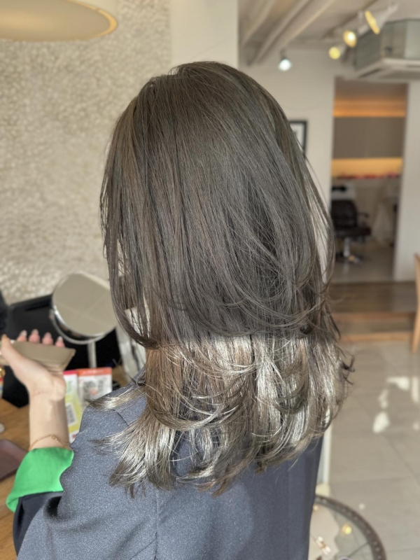 こんにちは!デザイナーのAyumiです!ブリーチなしでできる明るめオリーブミントベージュカラーにレイヤーカットおすすめです^ ^カラーの色持ちや艶を維持するためにも【Aujua髪質改善トリー...