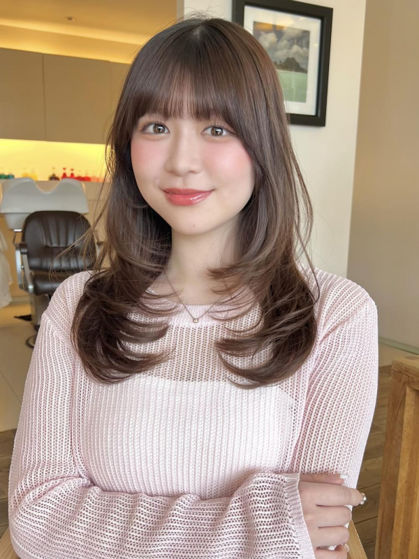 こんにちは!デザイナーのAyumiです!ピンクブラウンベージュカラーにふんわりミディアムレイヤーカットおすすめです^ ^カラーの色持ちや艶を維持するためにも【Aujua髪質改善トリートメント...